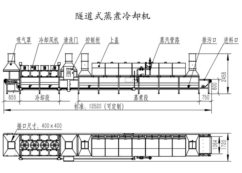 1、本产品采用高温蒸汽将食品进行蒸煮,从而达到食品加工工艺要求,蒸煮后可对食品进行简单的冷却,便于后续速冻以及包装;